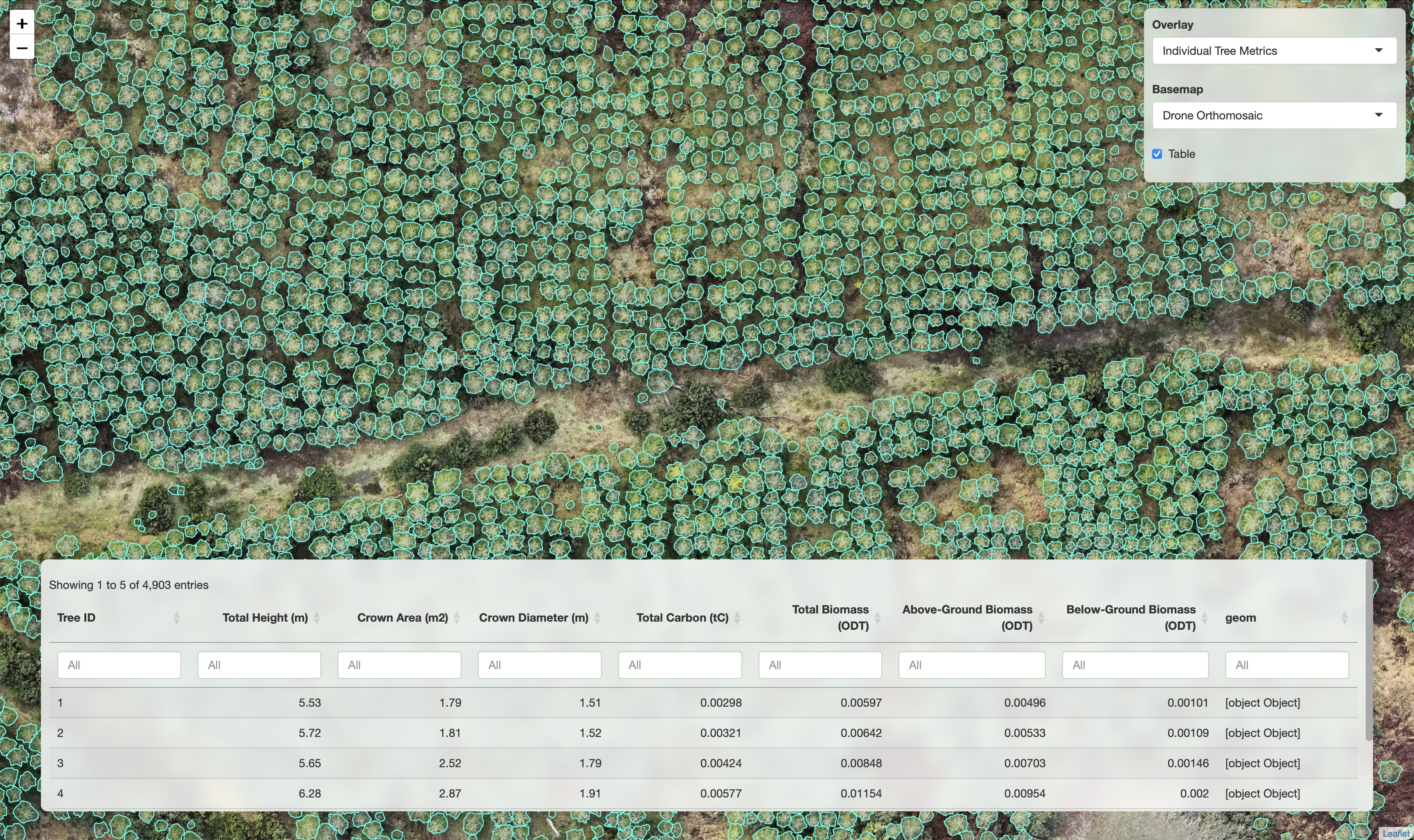 This approach uses drones, deep learning and a custom spatial analysis to map woodland at the individual tree level, with valuable metrics reported for each. I have created a custom web map to visualise the results, reach out for access to a demo.