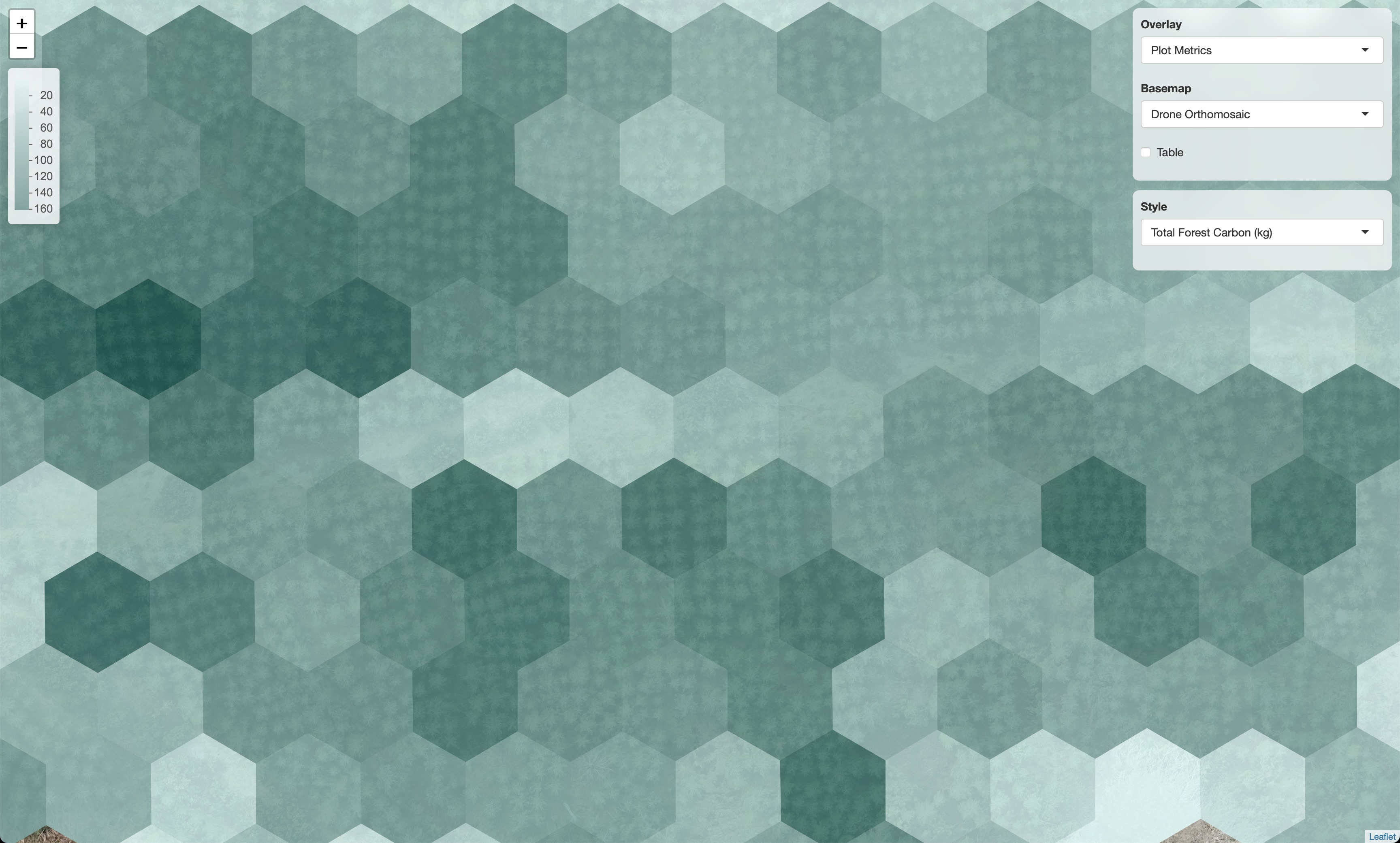 Different metrics such as stem density and carbon estimates are presented in a hexagonal grid.
